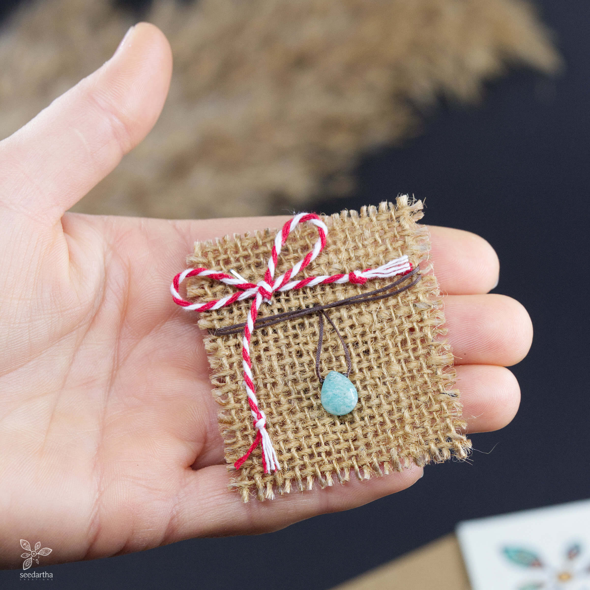 Martisor cu Amazonit handmade ce poate fi purtat prins in piept, dar si mai departe ca si colier, dupa ce trece inceputul primaverii.